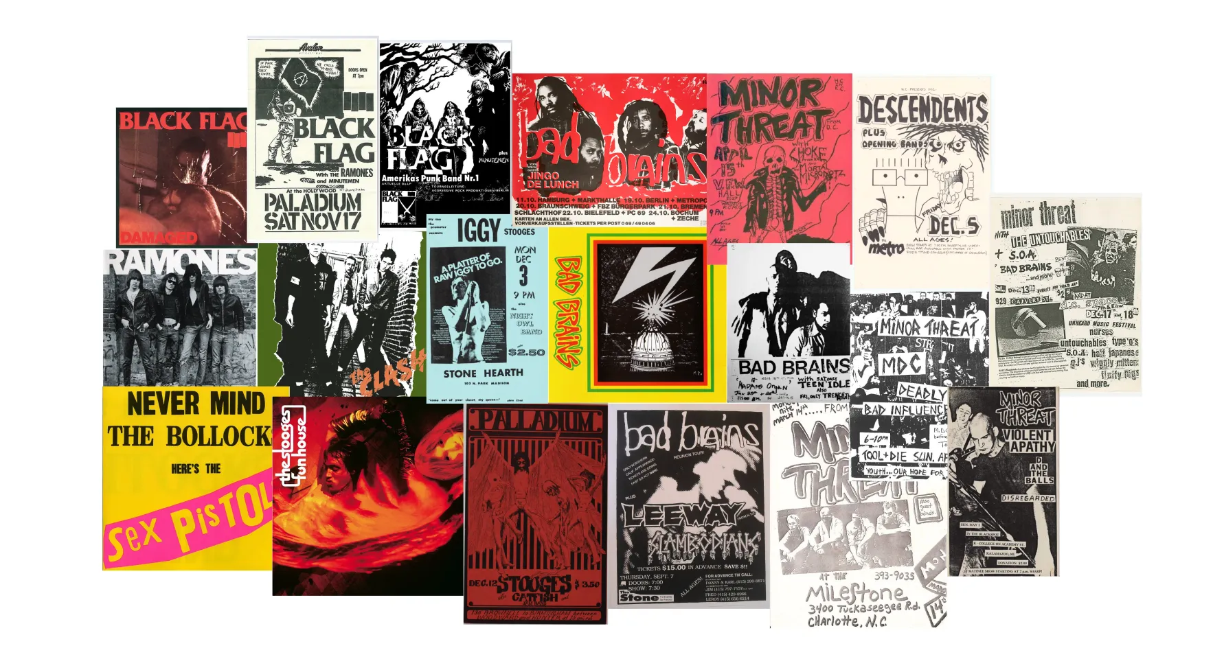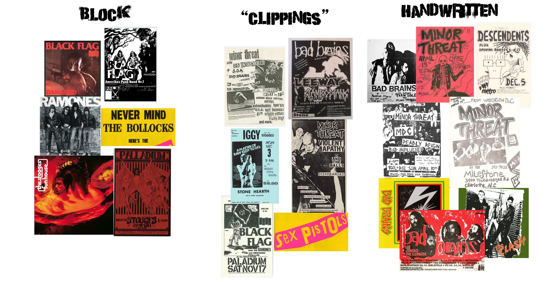 I started with the idea of a design reminiscent of classic punk posters. High contrast, simple colors, and slightly chaotic. I collected a bunch of images from the internet that hit the aesthetic I was going for: